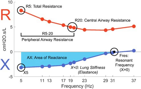 - Reactance (X): The compliance (stiffness/elastance) of the lung tissue (aka expandability of airways)
